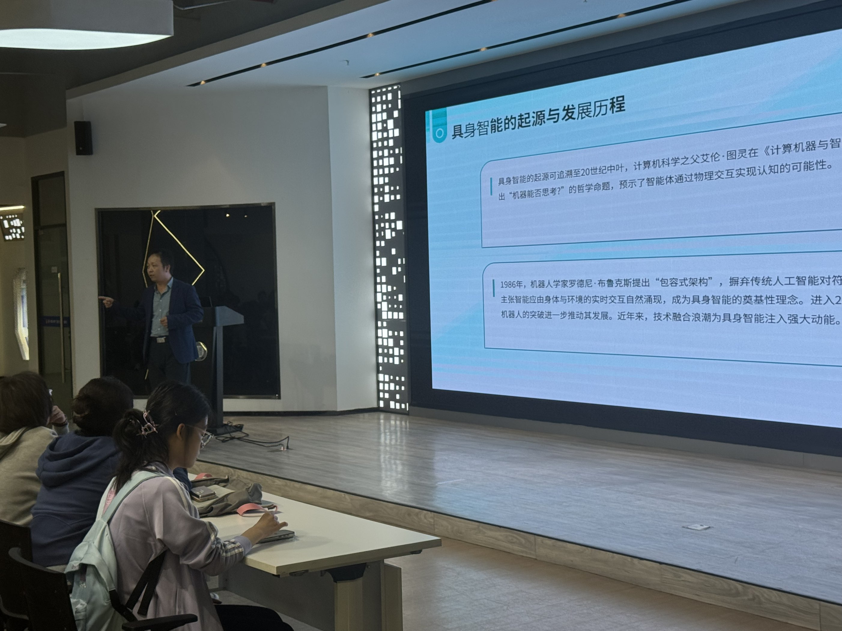 刘成老师围绕ROS(机器人操作系统)的技术架构及其在实际项目中的应用展开深度分享。他以清晰的逻辑、专业的视角,从ROS的核心组件讲起,结合机器人自主导航、感知决策等典型案例,详细解析了ROS在机器人系统开发全流程中的应用逻辑,为在场同学搭建起从理论到实践的认知桥梁。活动过程中,“讲解+案例+互动问答”的形式充分调动了同学们的参与积极性。