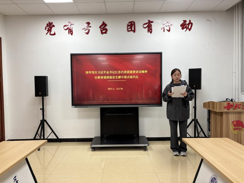 冯子怡同学领学习近平总书记参加江苏代表团审议时的重要讲话精神,围绕“一体推进教育科技人才发展”这一重点内容,阐释教育在发展新质生产力、服务高质量发展中的重要作用。她表示,作为新时代青年,要深刻领会总书记关于“教育、科技、人才是全面建设社会主义现代化国家的基础性、战略性支撑”的重要论断,将个人成长融入国家发展大局,努力成为支撑科技自立自强的高素质人才。
