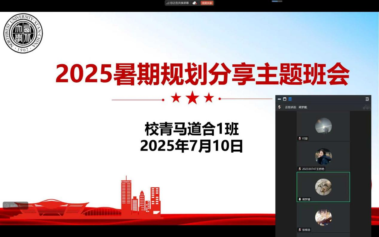 为引导学生科学规划暑期生活,积极投身社会实践,提升综合素养,西北大学“青马工程”第十七期大学生骨干培训班道合1班于近日线上举办暑期规划分享主题班会。班会围绕暑期实践、学术研究、个人成长等主题展开交流,旨在激发学生自主规划意识,实现假期生活的多元价值。
