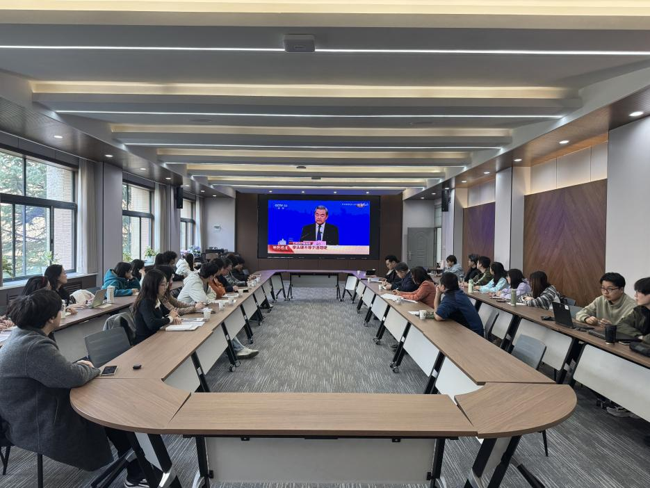 本次活动采用“线上自学、线下研讨、专家点评”的联动模式。前期,学员们自主线上观看了中共中央政治局委员、外交部长王毅就“中国外交政策和对外关系”回答中外记者提问的实况,并撰写了学习心得。线下环节,师生齐聚报告厅集中观看记者会视频,并就新时代中国特色大国外交展开深入研讨。